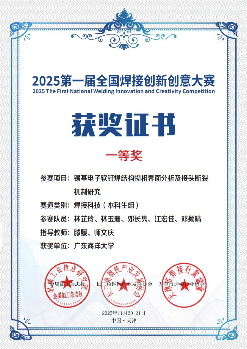 11月20至22日,“沪工杯”第一届全国焊接创新创意大赛在天津举办。我院材料成型及控制工程专业林芷玲、林玉珊、邓长隽、江宏佳、邓颖靖同学凭借项目《锡基电子软钎焊结构物相界面分析及接头断裂机制研究》斩获本科生组一等奖。