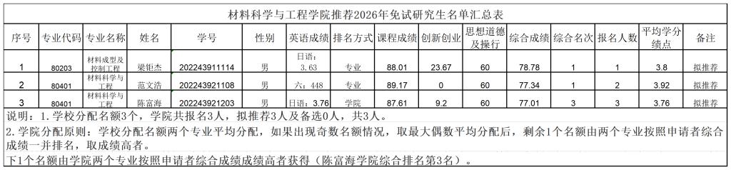 根据《关于开展推荐2026年优秀应届本科毕业生免试攻读研究生工作的通知》《bwin必赢推荐优秀应届本科毕业生免试攻读研究生工作管理办法》《bwin必赢材料科学与工程学院推荐优秀应届本科毕业生免试攻读研究生实施细则(2025年修订)》的精神和要求,学院组织开展了2026年推免生遴选工作。经个人申请、学院审核、学院推荐优秀应届本科毕业生免试攻读研究生遴选工作领导小组审议,拟推荐2026年优秀应届本科生免试攻读研究生资格名单如下。