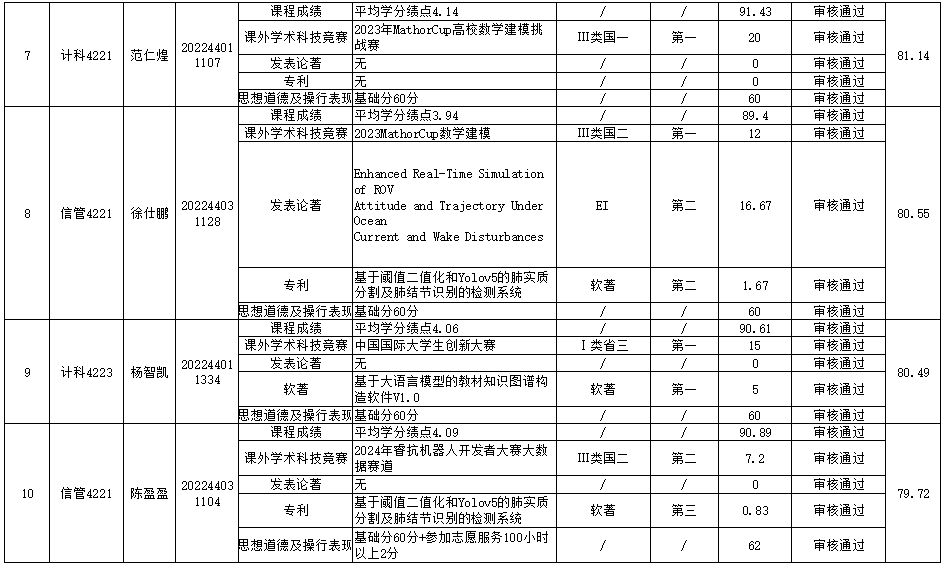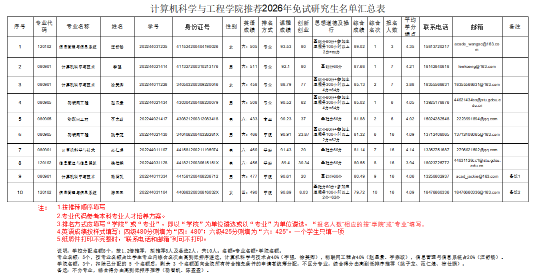 计算机科学与工程学院推免生遴选工作小组根据《bwin必赢推荐优秀应届本科毕业生免试攻读研究生工作管理办法》(校教务〔2024〕70号)和《计算机科学与工程学院推荐优秀应届本科毕业生免试攻读研究生实施细则》的规定,经学生个人申请、资格审查、学院专家审核小组审核鉴定、学院推免生遴选工作小组综合评定、学院党政联席会议审议通过等程序,确定推荐人选10位同学。