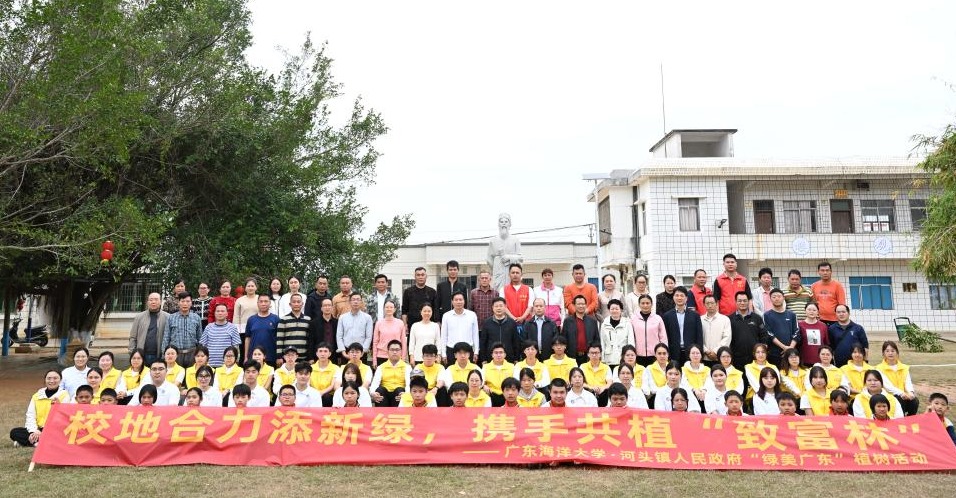 在河头镇双村小学,我校师生与当地干部群众组成“帮扶对子”,挥锄挖坑、扶树填土、浇水灌溉,将学校科研成果“海大4号”菠萝蜜树植入沃土,一个更加绿色、和谐的乡村画卷正在徐徐展开。学校今年计划支持河头镇种植5000棵菠萝蜜树苗,目前1500棵已扎根田西村、吴良村和山域村沃土,活动当天种植了330棵,预计4年后将迎来首个丰收季。