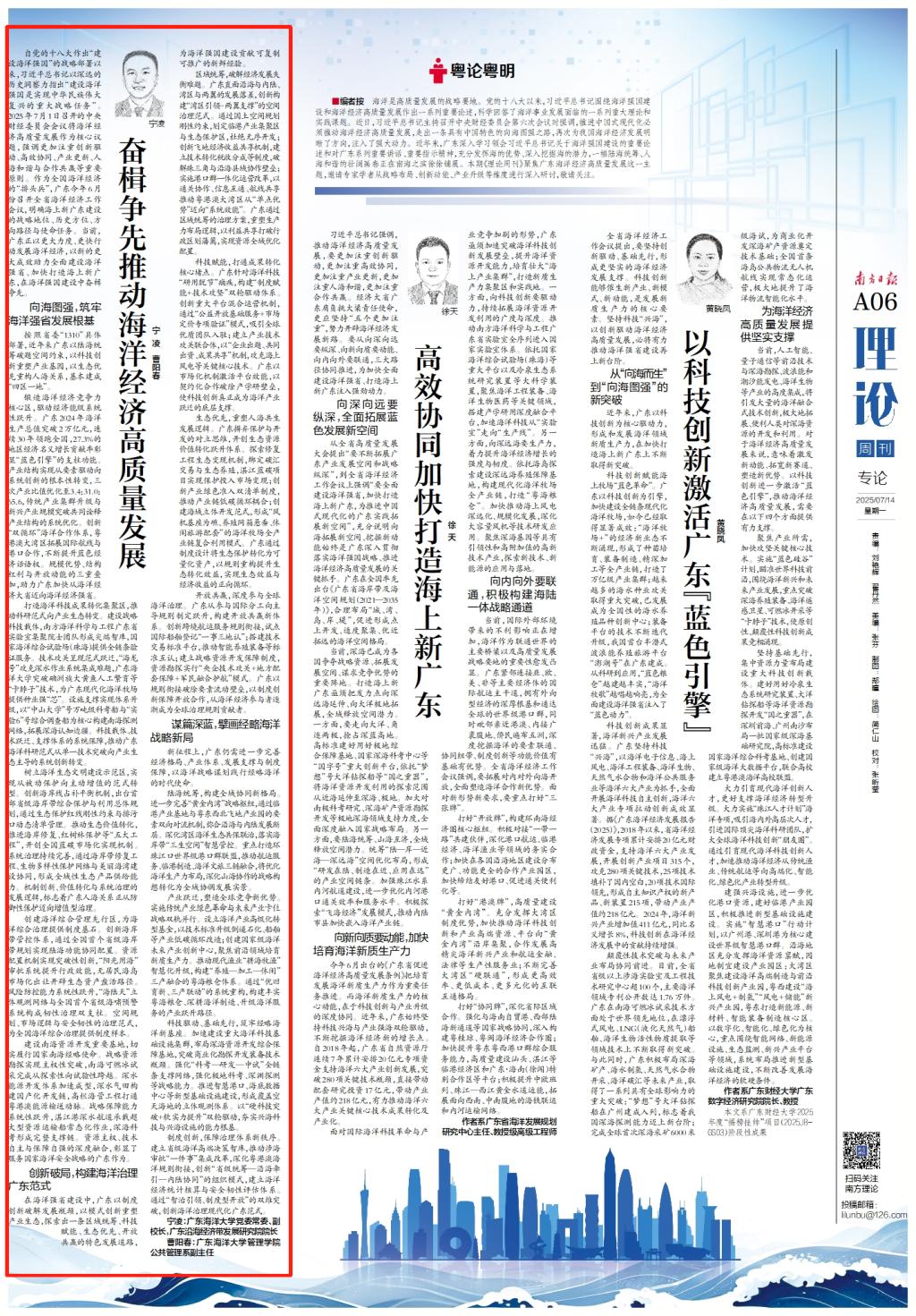 7月14日,南方日报《理论周刊》刊发我校党委常委、副校长,广东沿海经济带发展研究院院长宁凌教授、管理学院公共管理系副主任曹阳春老师撰写的题为《奋楫争先推动海洋经济高质量发展》理论文章。该期《理论周刊》聚焦广东海洋经济高质量发展这一主题,邀请专家学者从战略布局、创新动能、产业省级等维度进行深入研讨,重点呈现广东海洋经济建设成就与亮点。该文从筑牢海洋强省发展根基、构建海洋治理广东范式、擘画经略海洋战略新局等方面,展现了广东海洋经济高质量发展的成就、亮点与展望,并明确了海大在广东现代化海洋牧场种业强“芯”中的重要地位。