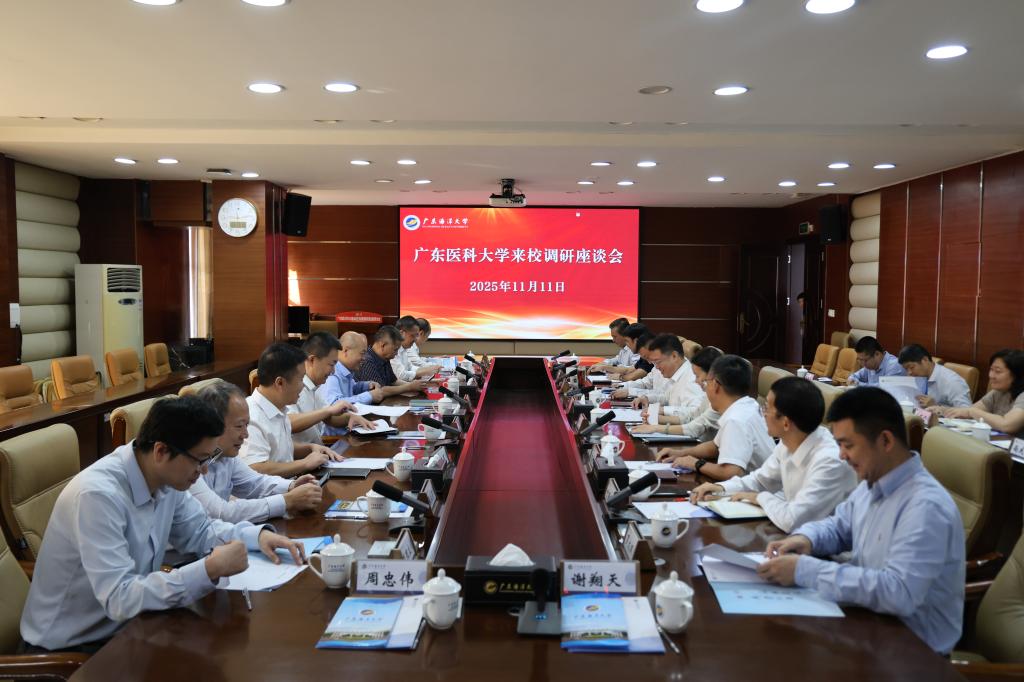 11月11日,广东医科大学党委书记卢景辉,党委副书记、纪委书记向献兵,党委常委、副校长石明率队到学校开展调研交流。学校党委书记杨洲主持调研座谈会,党委副书记谭平,党委常委、副校长鲁义善参加调研。两校相关职能部门及学院负责人共同参加座谈会。双方围绕高质量党建、学科建设、科研创新、人才培养等多项议题展开深入交流,共同探讨校际合作新路径,助力区域经济社会高质量发展。