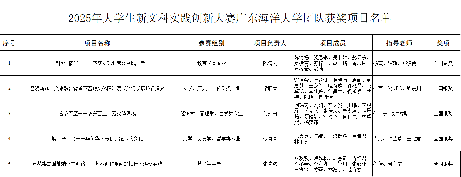 近年来,学校依托“红蓝绿”大海洋思政课体系,高度重视学生实践创新能力培养,推动实践教学与专业教育、思政教育深度融合,积极引导学生扎根实际开展创新探索。此次取得佳绩,既是对我校新文科实践教学成果的一次集中检验,也是学校“以赛促教、以赛促学、以赛促创”育人机制的生动体现。学校将以此为契机,进一步总结实践经验,深化教学改革,促进创新成果转化与应用,持续培养兼具创新精神、实践能力和社会责任感的高素质文科人才,为新文科建设和高质量发展贡献力量。