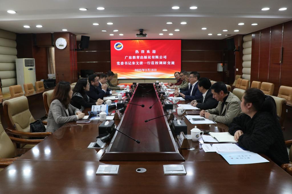 3月18日下午,广东教育出版社有限公司党委书记朱文清一行到我校座谈交流。学校党委常委、副校长谭北平会见了朱文清一行并主持座谈会。宣传统战部、学生工作部、教务部、科学技术部、国际交流合作部、学报编辑部、现代教育技术中心等部门相关负责人参加座谈会。