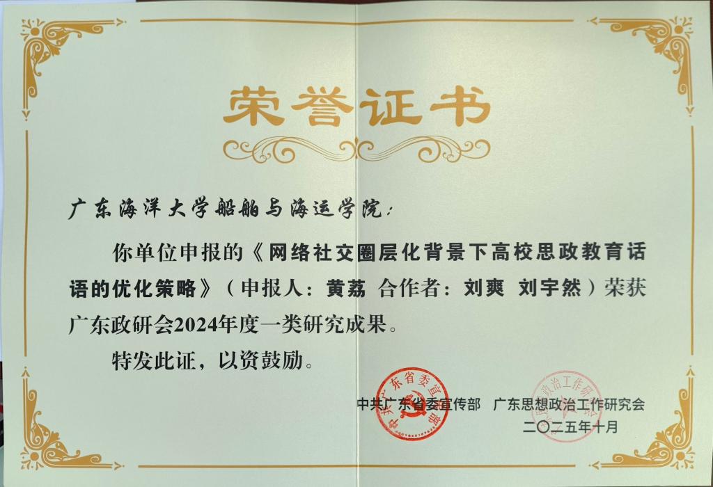 近日,广东省委宣传部、广东思想政治工作研究会联合印发了《广东政研会2024年度优秀研究成果和组织工作优秀单位名单》,我校船舶与海运学院辅导员黄荔、刘爽、刘宇然撰写的学术论文《网络社交圈层化背景下高校思政教育话语的优化策略》荣获一类研究成果。