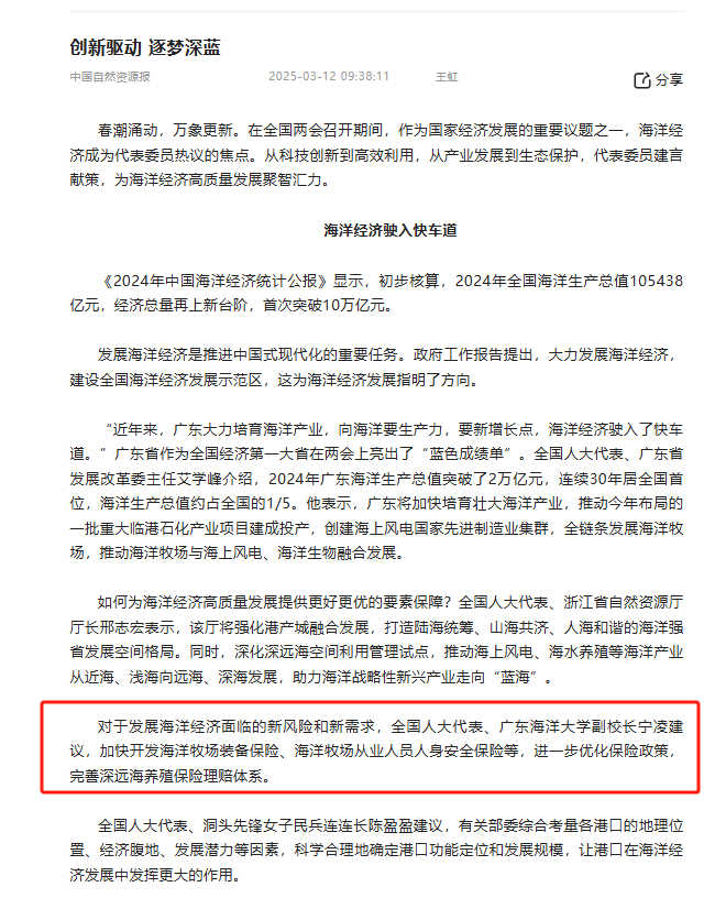 相关报道链接:创新驱动 逐梦深蓝—— 全国两会代表委员建言献策海洋经济高质量发展