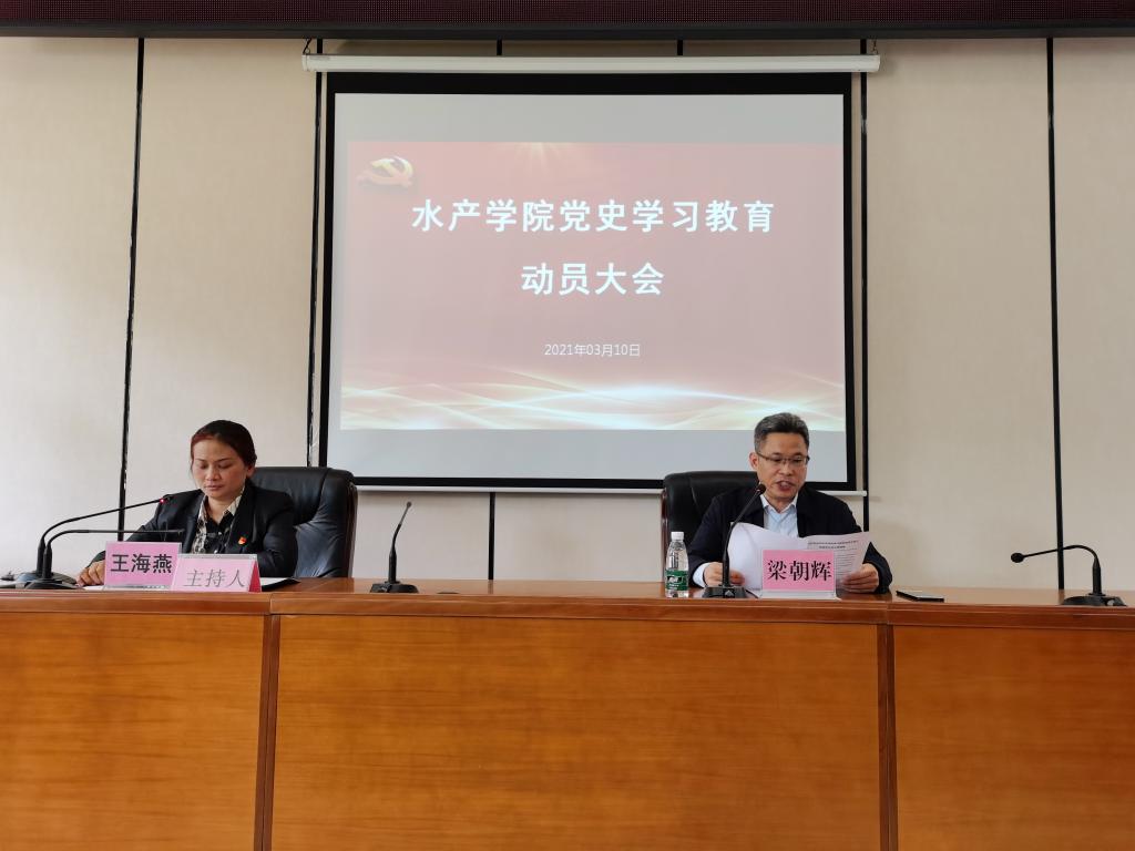 3月10日、11日中午,水产学院党委在湖光校区水产楼109会议室召开二场党史学习教育动员大会,认真学习贯彻习近平总书记在党史学习教育动员大会上的重要讲话精神和中央、全省、全校党史学习教育动员大会精神,对学院开展党史学习教育进行动员部署。会议由学院党委副书记王海燕主持。学院领导和全体教工党员、学生党员参加会议。
