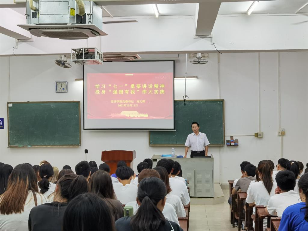 10月11日晚,经济学院党委书记肖文辉、院长居占杰分别在钟海楼和主楼教室面向学院本科生讲授2021年秋季学期“思政第一课”。