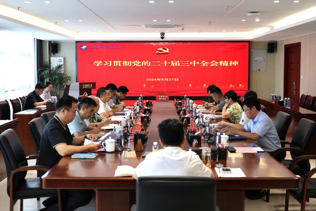 9月27日下午,阳江校区党委在海纳楼712会议室召开党委理论学习中心组(扩大)会议,专题学习党的二十届三中全会精神。受校党委常委、副校长、阳江校区党委书记、管理办公室主任周昌仕的委托,校区党委副书记丁永成主持会议并讲话。校区党委理论学习中心组成员及校区各党总支书记参加学习。