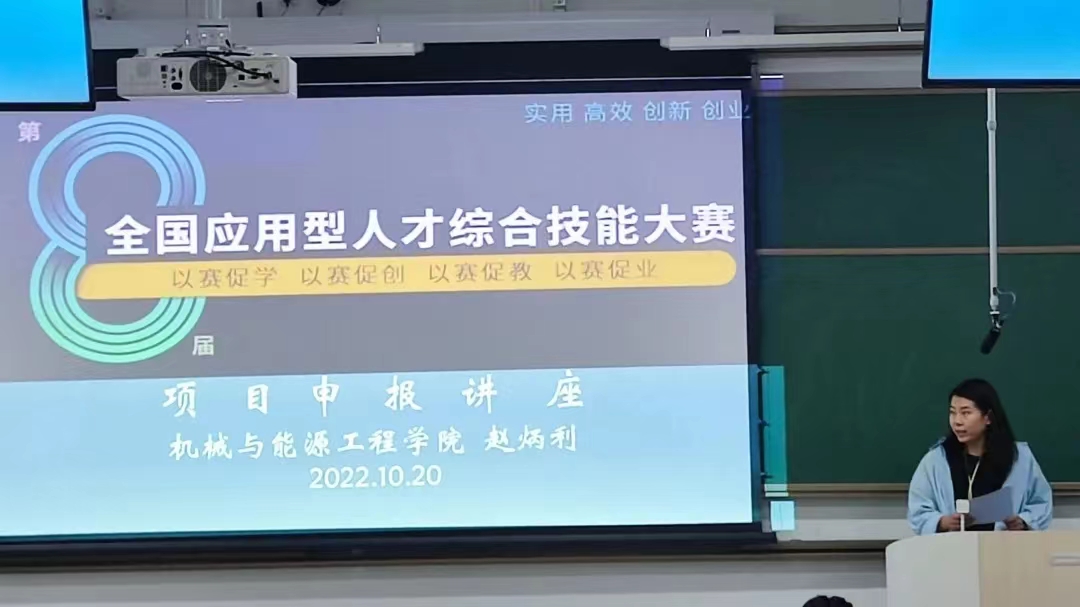为贯彻落实习近平总书记在党的二十大关于技能人才工作的重要指示精神,积极广泛宣传全国应用型人才综合技能大赛的相关内容,进而提高学生参与技能竞赛的积极性,增强学生技能水平,营造良好的学习氛围,2022年10月20日晚,机械与能源工程学院在慎思楼A102为学院100多名学生开展了一场主题为“聚青春,创梦想”的专题讲座。讲座由李桀老师主持,赵炳利副教授主讲。
