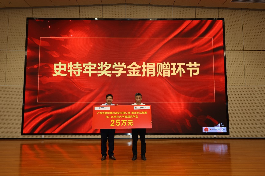 陈扬枝院长作为院方代表接受熊业军总经理的奖学金捐赠,表示阳江校区与史特牢同期开始建设以来,校企紧密合作,双方在实习基地建设、学生实习实践、科研攻关等方面达成共识,携手共进求发展,他对史特牢的慷慨解囊表示高度的赞扬。