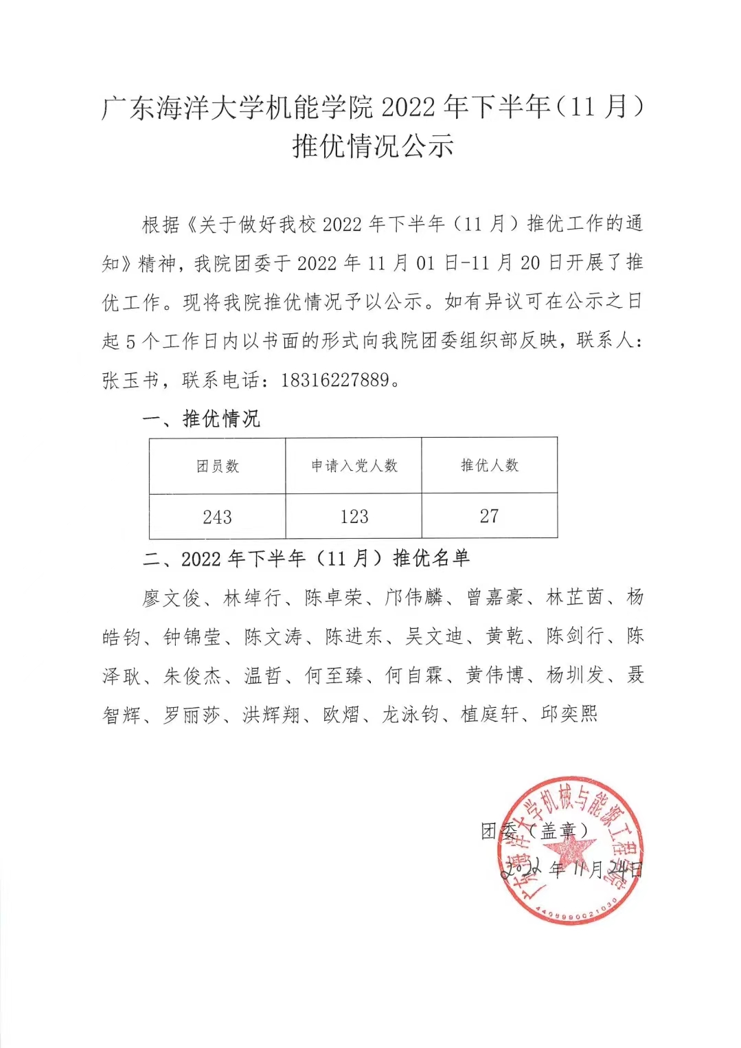 bwin必赢机械与能源工程学院2022年下半年(11月)推优情况公示