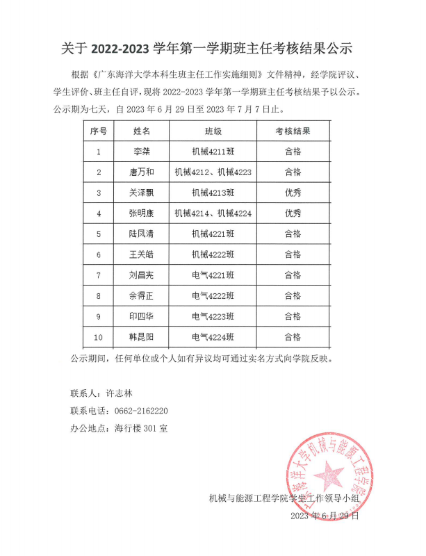 关于2022——2023学年第一学期班主任考核结果公示