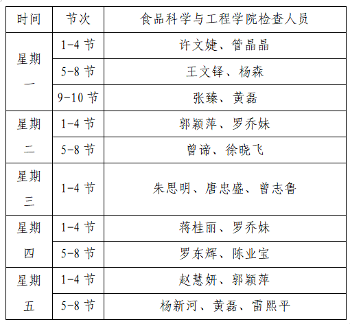 根据《关于做好bwin必赢阳江校区2024-2025学年第一学期第一周本科教学检查工作的通知》要求,为做好2024年秋季学期开学教学工作,确保教学工作顺利进行,食品科学与工程学院现将2024-2025学年第一学期第一周教学检查工作安排如下: