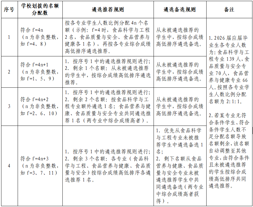 根据学校划拨的推免生名额,学院推免工作领导小组根据资格审查和综合评定情况,按学生综合成绩由高到低排序,原则上按分配名额的1.2倍(使用进一法取整数)确定遴选推荐名单。设学校划拨的推免生名额数为f,具体遴选推荐规则和遴选备选规则如下。