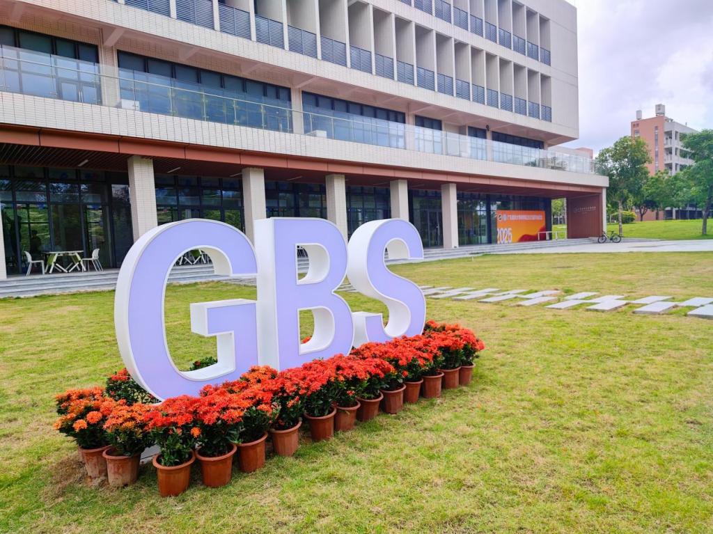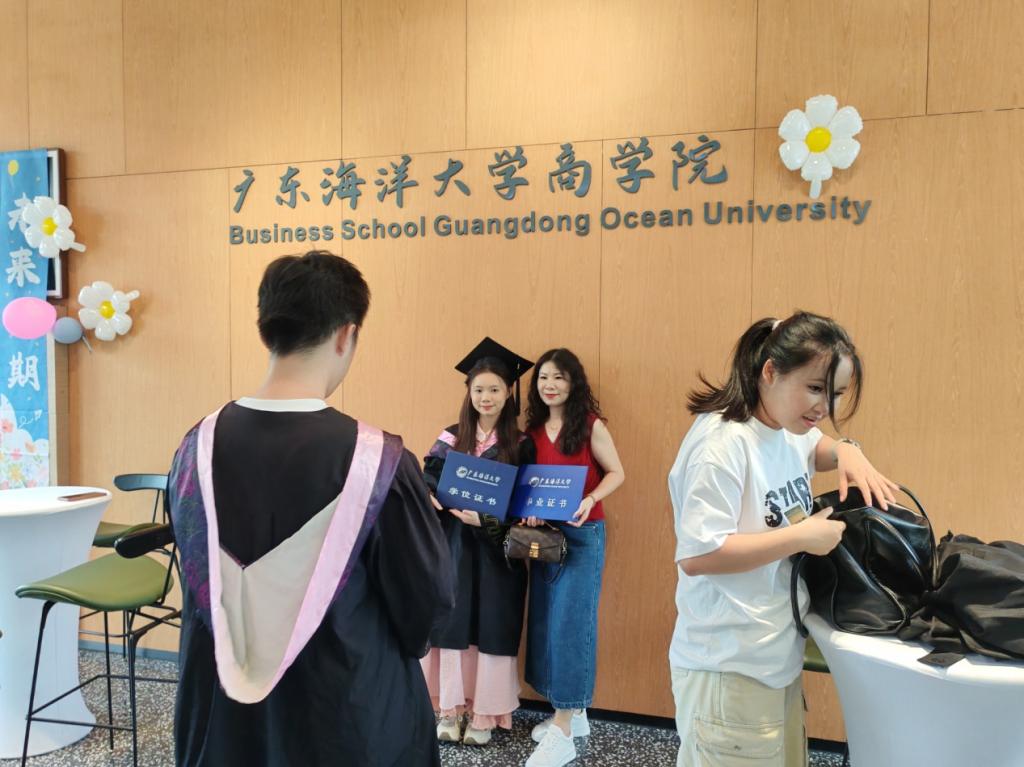 毕业生与家人在专属于商学院的毕业打卡点照相留念