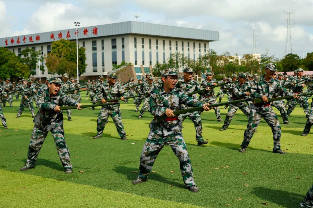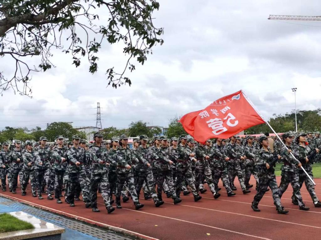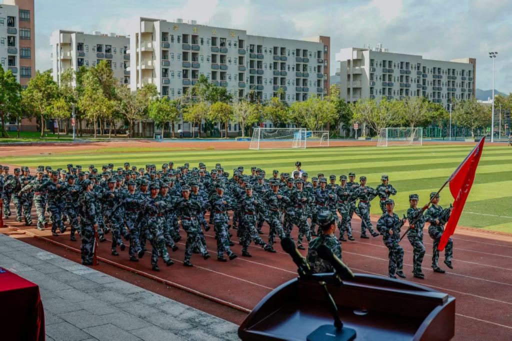接下来的14天,在承训部队教官的严格指导与耐心带教下,一场场紧张有序的训练在训练场铺展开来。这不仅是军事技能的锤炼,更是意志与担当的磨砺。从晨光熹微时的站军姿开始,到正午烈日下的方阵训练,再到暮色中的战术演练,每个动作都力求标准,无论多么辛苦也没人喊放弃。九月的广东天气无常,烈日常把迷彩服浸出层层盐渍,骤雨又会瞬间浇透衣背,学子们抹一把脸上的水——分不清是汗水还是雨水,依然咬牙跟上训练节奏。更难忘台风过境前夕,狂风卷着乌云压向操场,教官临时调整训练方案,学子们挤在雨棚下,反复揣摩队列动作要领。承训教官看着浑身湿透却眼神发亮的学子,忍不住感慨“这股韧劲,不输军人!”正是这样的坚持,让5营学子一步步掌握了站军姿、走方阵、战术演练等各项军事技能,也让“坚韧不拔”成了这段时光最鲜明的注脚。
