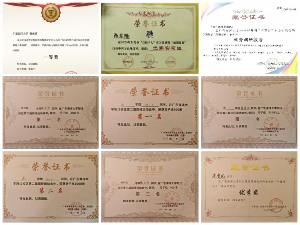 学习之余,班级的各位同学在社会实践活动中努力进取。黄永琪同学在第六届全国高校计算机能力挑战赛Word赛项中获得国赛一等奖;陈希瑞同学组建的“海潮青春”国家资助政策下乡行队伍,深入到经济困难的家庭中点对点入户走访,获得广东省级优秀团队、省级优秀调研报告等荣誉称号;陈思楠同学获得了2023年暑期东莞市优秀实习生的荣誉称号;陈梓杰同学组建的百县千镇万村高质量发展工程团队在暑期前往阳春市省级现代农业产业园,实地走访种植农户,结合专业所学为当地发展提供帮助,其余班级成员也分别在9支不同的实践队伍,为乡村振兴贡献出自己的一份力量。