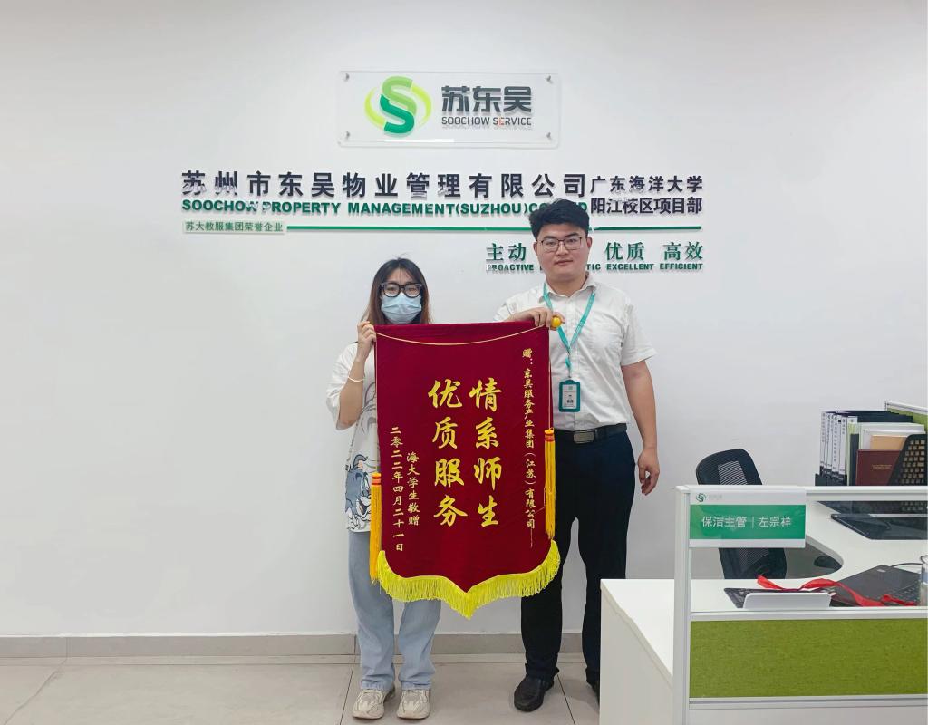 4月27日下午,阳江校区后勤保障部收到一份特殊的礼物,食品科学与工程学院的刘同学将一面绣着“情系师生、优质服务”的锦旗送到工作人员的手中,向不辞辛苦、勇于担当的工作人员表达诚挚的感谢。