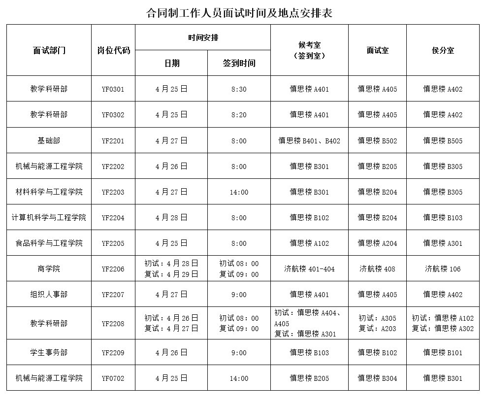 现将4月25日至29日阳江校区合同制工作人员面试考场安排通知如下,请按照以下时间准时到达阳江校区(江城区白沙街道罗琴路1号),按以下地点到位。