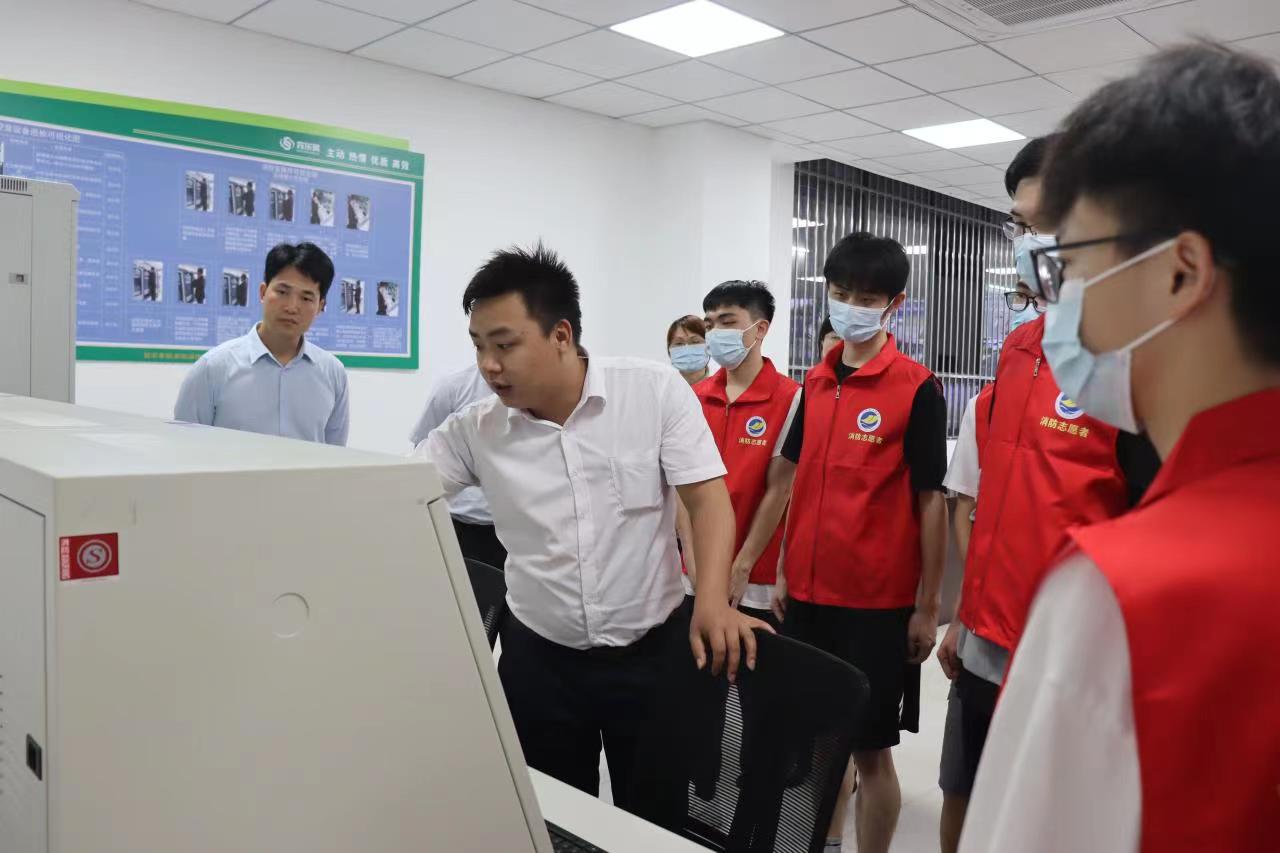 在海纳楼,安保队长冯子均给大家介绍了全校消防预警、消防警报及防火系统,工程主管潘洪辉实际操作了校园防火卷帘的使用操作。