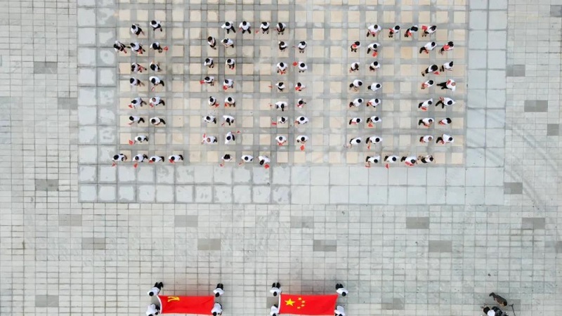 大会结束后,全体党员干部来到校区北门广场,在洪鹏志的带领下,全体党员干部举起右手,重温了入党誓词。随后,全体党员干部先后在校区北门广场、足球场分别摆出“100”和党徽的队形,齐挥党旗,深情齐唱《不忘初心》,深情表达对党和祖国的热爱和感恩。