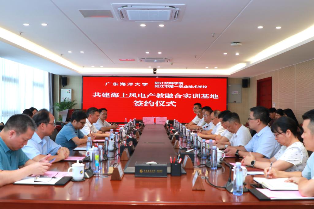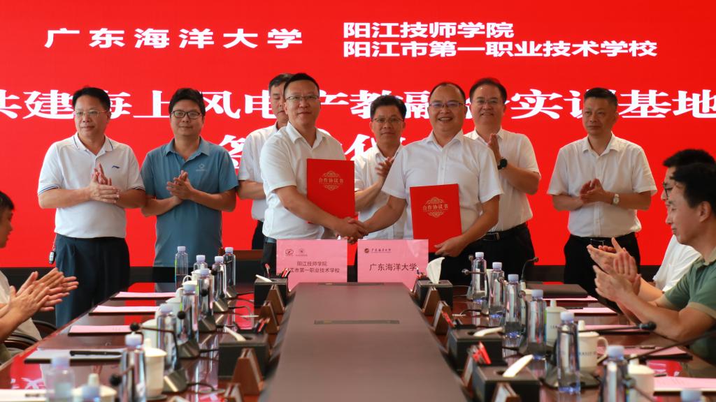 7月4日下午,我校与阳江技师学院、阳江市第一职业技术学校共建海上风电产教融合实训基地签约仪式在校区海纳楼712会议室举行。党委常委、副校长、阳江校区党委书记、校区管理办公室主任周昌仕与阳江技师学院院长、阳江市第一职业技术学校校长林进杰分别代表两校签约,阳江校区党委副书记丁永成、陈永强,以及阳江技师学院、阳江市第一职业技术学校党委书记谭志葆,副院长陈志军、洪海等领导参与见证。