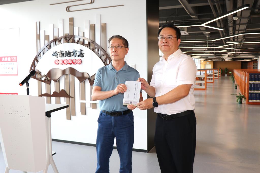 随后,陈永强向陈泽泓颁发捐赠纪念册并代表中心接受陈泽泓的新书捐赠。陈泽泓致辞表示图书馆是校园文化最重要的根基,也是岭南地方志文献交流中心的守门员。岭南海洋文化领域在中华民族文化里面具有突出特色,夯实文献基础建设,对当代大学生深入研究岭南地方文化,了解岭南文化底蕴,提高文化传承意识增强文化自信具有深远意义。