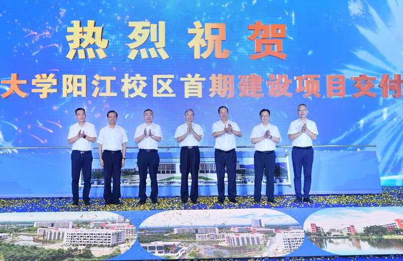 活动现场,省教育厅二级巡视员朱俊文,校党委书记曹俊明,校长潘新祥,阳江市委书记林道平,华南理工大学党委书记章熙春,阳江市政协主席杨文龙,阳江市委常委、常务副市长李勇毅共同推杆完成bwin必赢阳江校区首期项目交付。