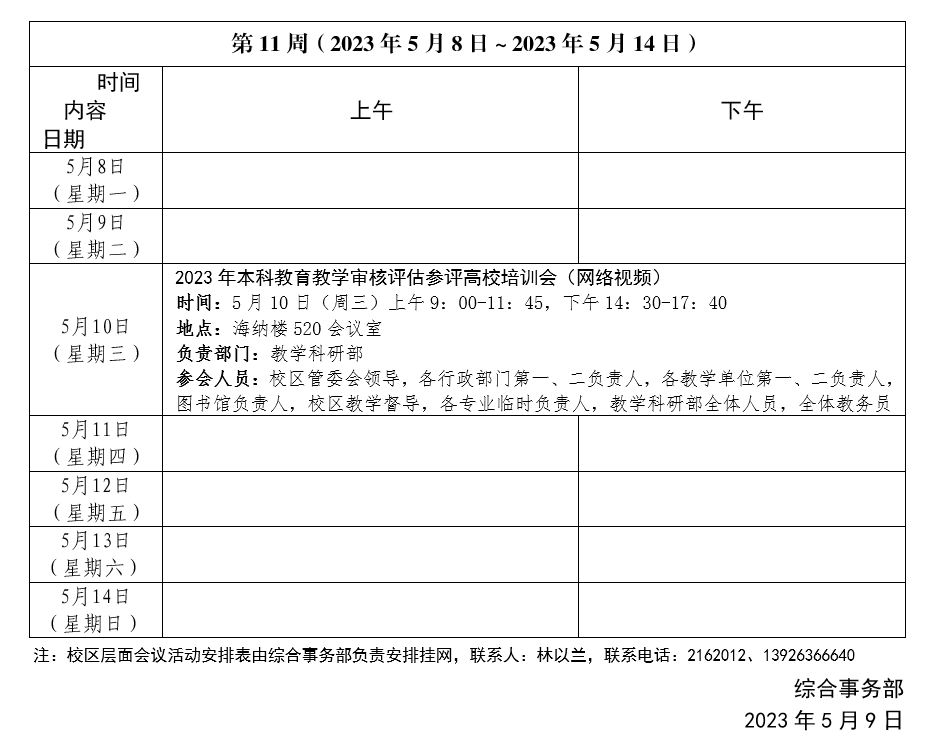 2022~2023学年第二学期第11周会议活动安排表