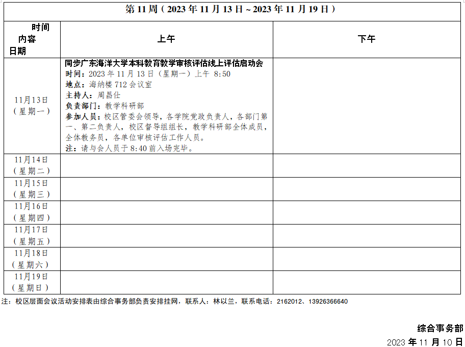 2023~2024学年第一学期第11周会议活动安排表