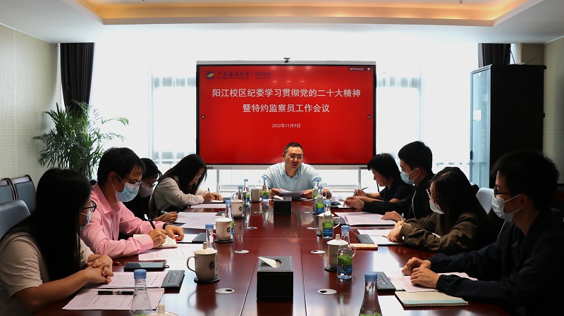 11月9日下午,阳江校区党委委员、纪委书记毛琪在校区海纳楼711会议室主持召开会议,专题学习贯彻党的二十大精神。学校纪委委员、阳江校区学生事务部第一负责人邓朝晖以及校区全体特约监察员参加会议。