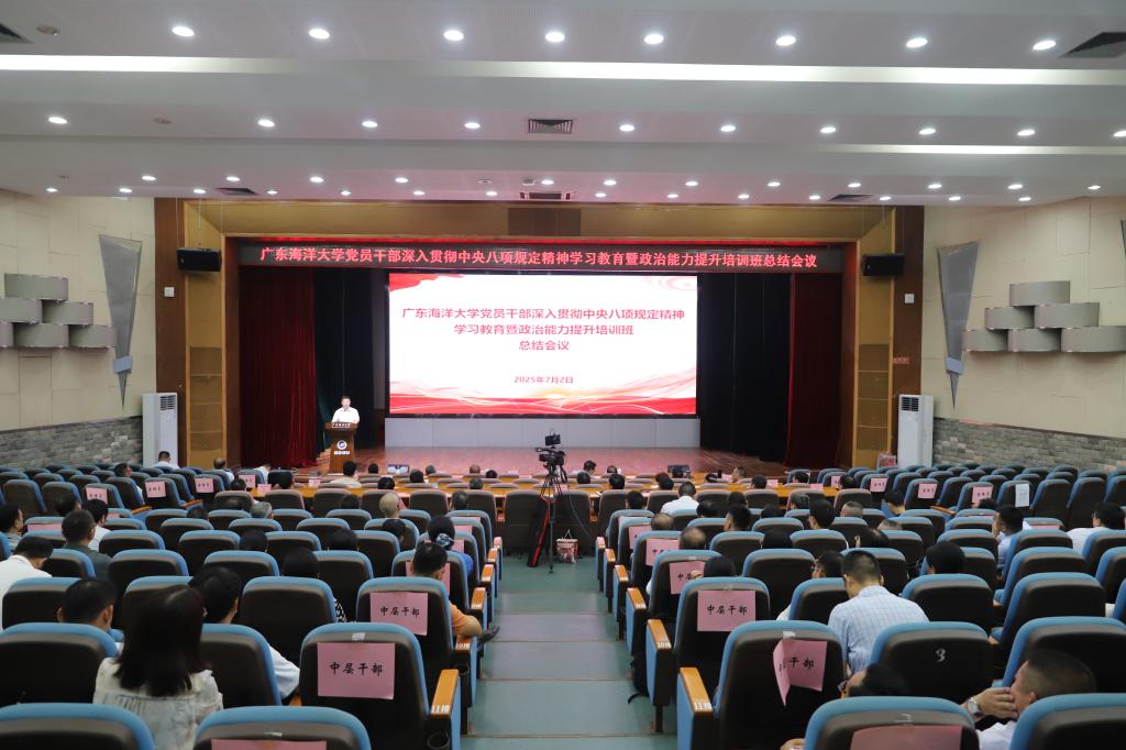 在总结会议上,学校党委书记杨洲讲话,指出本次培训班聚焦主责主业有效施训,紧扣中央八项规定精神,将政治理论学习与学校发展实践紧密结合,开设系列专题培训,切实提升培训的针对性与实效性。突出重点群体精准施训,以中层领导干部学习研讨为核心,并针对年轻干部、关键岗位干部、新提拔干部、纪检监察干部、机关科级干部、宣传员等不同群体,分类开展不同专题培训。同时,采用线上线下融合模式,实现阳江校区跨校区协同培训。创新培训方式灵活施训,综合运用专题辅导、现场教学、自学等多样化形式,增强培训吸引力与感染力。